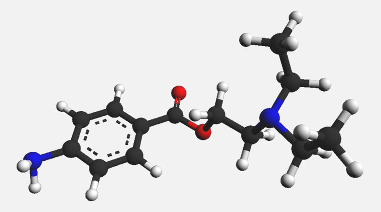 Procaine is a local anaesthetic - an ester type - which is used as a local anaesthetic very seldom today, since much more effective and more deeply penetrating substances like for example lidocaine are available, where allergic reactions are less occurring. However, procaine is still used in the neural therapy, a type of treatment from the areas of alternative or animal medicine.