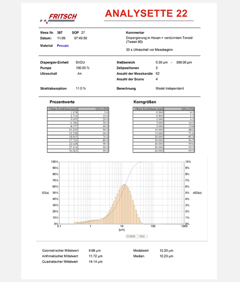 The shown particle size distribution was measured with the ANALYSETTE 22 with a small volume dispersion unit. As a solvent hexane was used since procaine is soluble in water and also in methanol. Prior to the measuring, a suspension of hexane and small amounts of a surfactant were pre-dispersed in an external ultrasonic bath.