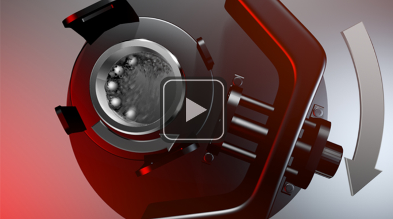 The comminution of the material to be ground takes place primarily through the high-energy impact of grinding balls. To achieve this, the grinding bowl, containing the material to be ground and grinding balls, rotates around its own axis on a main disk whilst rotating rapidly in the opposite direction. At a certain speed, the centrifugal force causes the ground sample material and grinding balls to separate from the inner wall of the grinding bowl. The grinding balls then cross the bowl at high speed and further grind the sample material by impact against the opposite bowl wall. In addition, impact between the balls themselves on the sample material adds to the size reduction process. Due to the rotational speed of the main disk – up to 400 rpm – achieves the PULVERISETTE 5 classic line a centrifugal acceleration of up to 22 g.